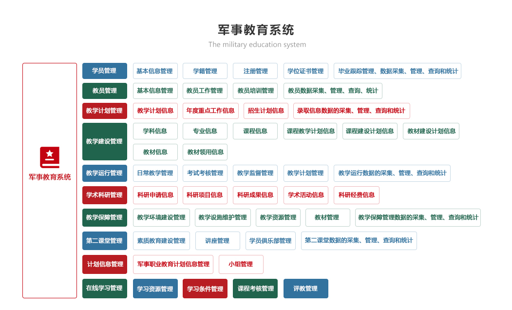 部隊管理系統 機關辦公系統 軍事教育系統 智慧政工系統 軍事訓練系統 后勤保障系統 智慧安防系統 裝備管理系統